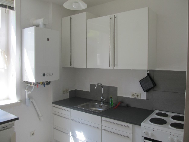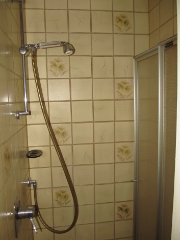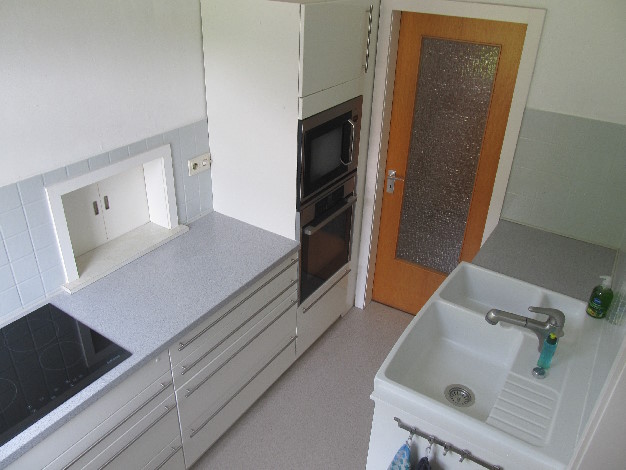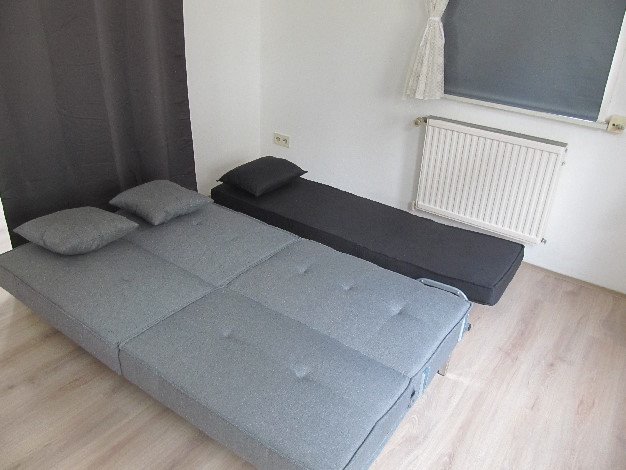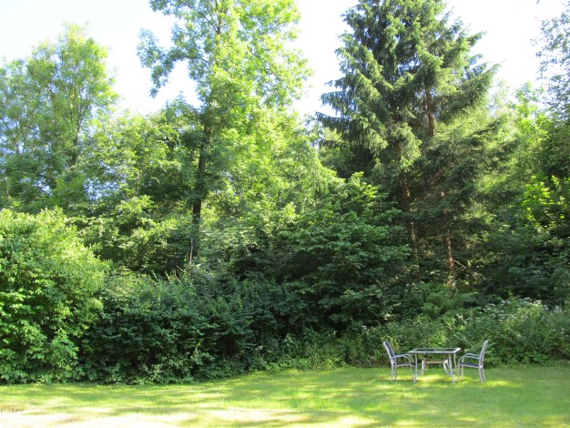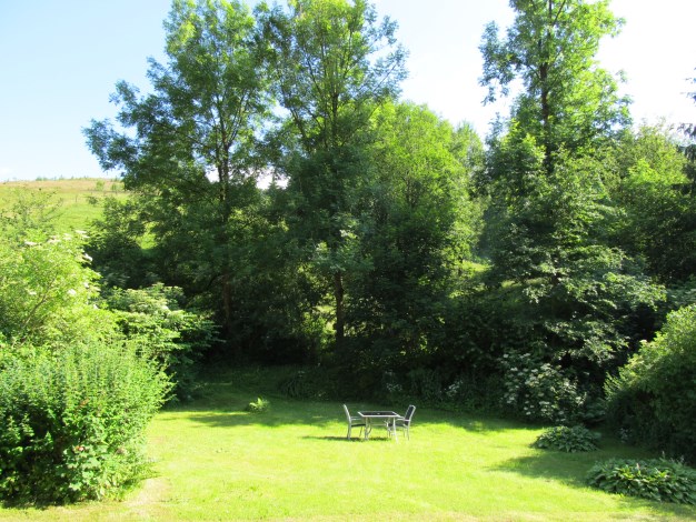 Die Wohnung links hat ein gemütliches Wohnzimmer mit Schlafsofa und einem Fernseher mit DVD-Player. Die Küche ist mit einem Keramikkochfeld, Kühl-Gefrierkombination, Backofen, Mikrowelle, Kaffeemaschine und Wasserkocher ausgestattet. Das helle Schlafzimmer bietet Blick auf den großen, sonnigen Garten und die angrenzenden Berge.
